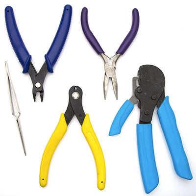 This Jewelry Making Tool Kit & Carrying Case from Cousin includes 6 craft & jewelry tools in a convenient zippered case. Set includes 6 basic jewelry making tools, including round nose pliers, flat nose pliers, long nose pliers, wire flush cutters, tweezers/scoop tool, and bead reamer.